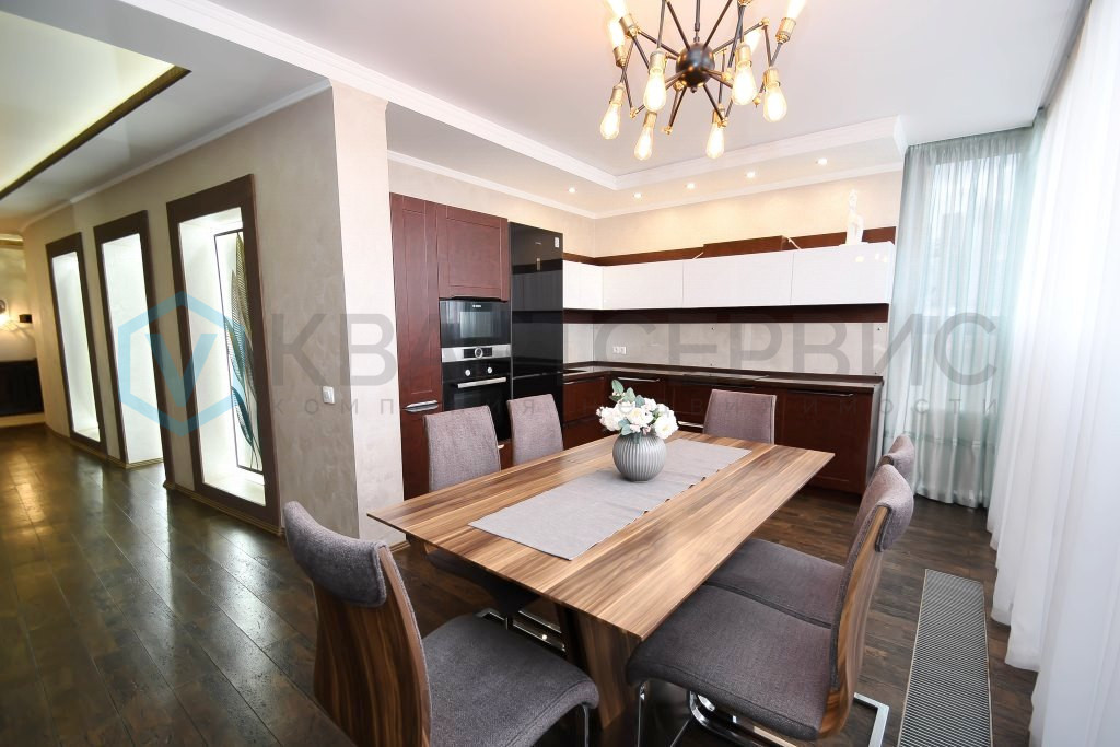 Мебель и техника: квартира продается полностью меблированной и оснащенной хорошей бытовой техникой. Кухонный гарнитур выполнен на заказ: фасады под кожу, столешница из камня, все встроенная техника- посудомоечная машина, духовой шкаф, варочная поверхность немецкой фирмы Bosch . Столовая группа - большой стол и стулья выполнены из тика.