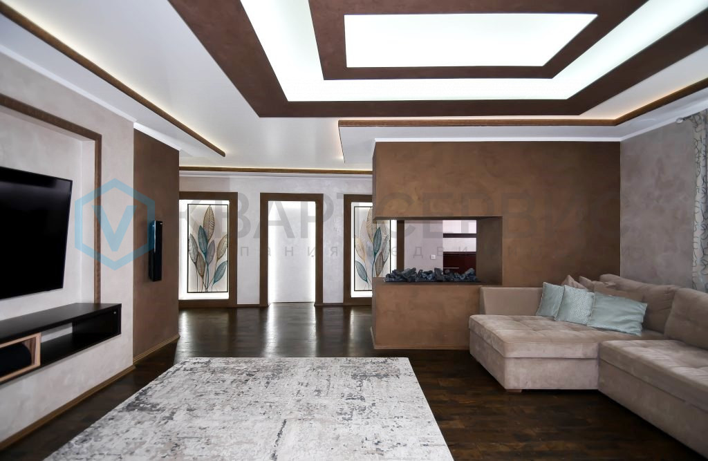 В гостиной установлен паровой камин, который создает атмосферу уюта, большой угловой диван, длинной 3,5 метра выполнен на заказ из антивандальной ткани, кондиционер марки Mitsubishi,так же установлена акустическая система Denon и большой телевизор Samsung.