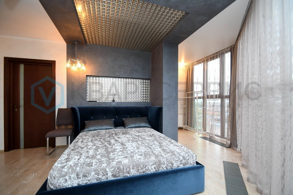 В спальне установлена большая кровать с подъемным механизмом, телевизор и оригинальный светильник в виде аквариума, в гардеробной эргономичная система хранения.