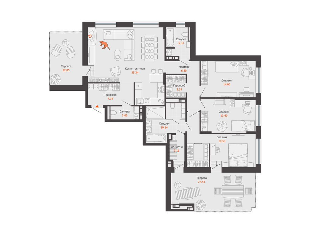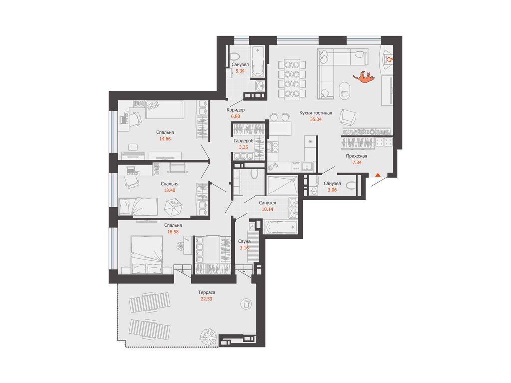 Квартира удачно распланирована и состоит из просторной кухни с панорамным остеклением, большой гостиной, хозяйской спальни с гардеробной, детской с выходом на застекленный балкон , кабинета, двух санузлов, прачечной и гардеробной.