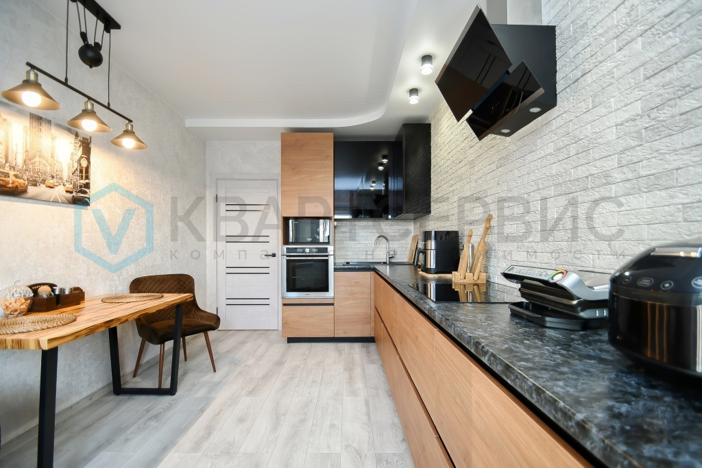 Ремонт: ремонт выполнен с полной заменой всех инженерных систем с использованием дорогостоящих материалов. Произведено утепление стен и подоконников. Вся сантехника и инсталляция — Hansgrohe (Германия). Душевая кабина на заказ из калёного стекла, стены облицованы европейским керамогранитом. Кухонный гарнитур со встроенной техникой. Вместительный шкаф-купе в прихожей. Вся мебель изготовлена по индивидуальному заказу. На полу — дорогой ламинат, установлены натяжные потолки. Балкон утеплён, остеклён и обшит декоративным кирпичом, есть дополнительный шкаф для хранения. На окнах — жалюзи.