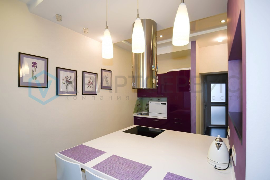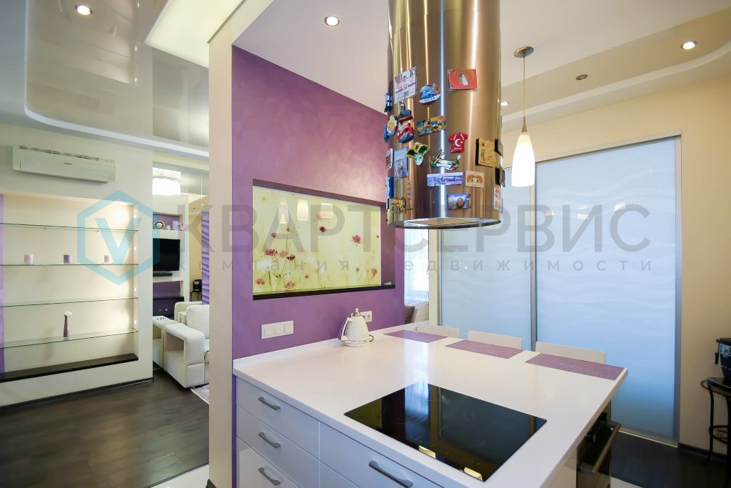 Сердце квартиры - гостиная с открытой кухонной зоной. Она оборудована необходимой бытовой техникой: варочная панель «Electrolux», духовой шкаф «Samsung», холодильник «LG», вытяжка «Jetair». Установлен кондиционер.