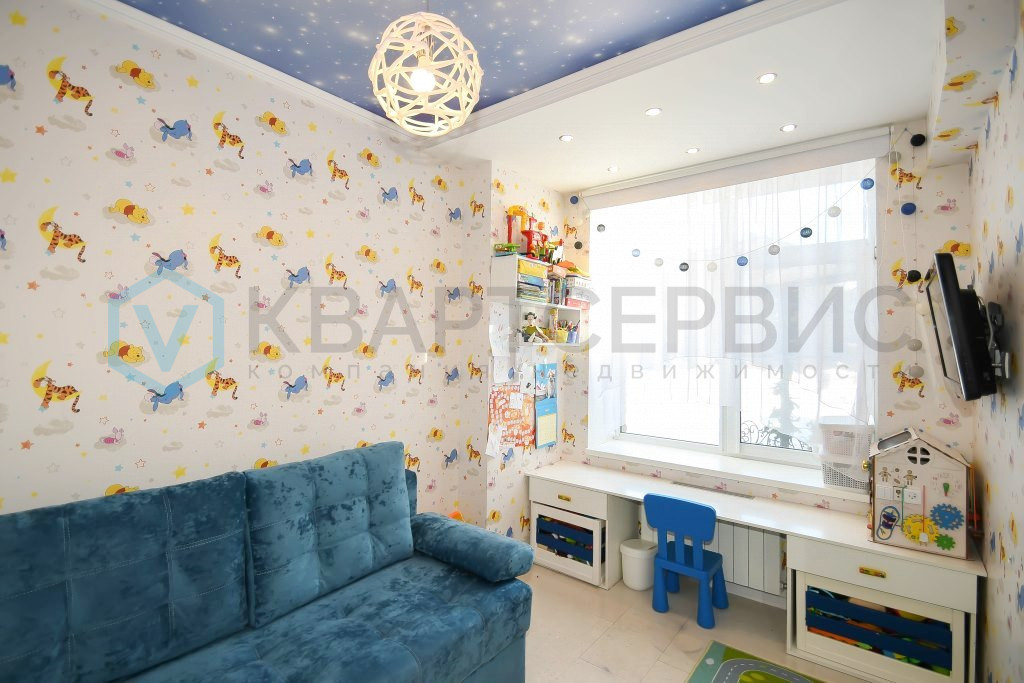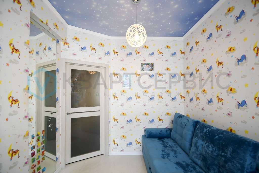 Квартира в хорошем состоянии: во всех помещениях натяжной потолок, на полу уложен качественный ламинат, в детской комнате - пробковое дерево. Санузел облицован кафелем, установлена система "теплый пол". Предусмотрены разные варианты освещения.