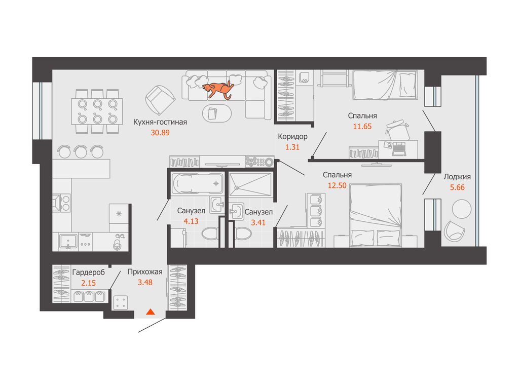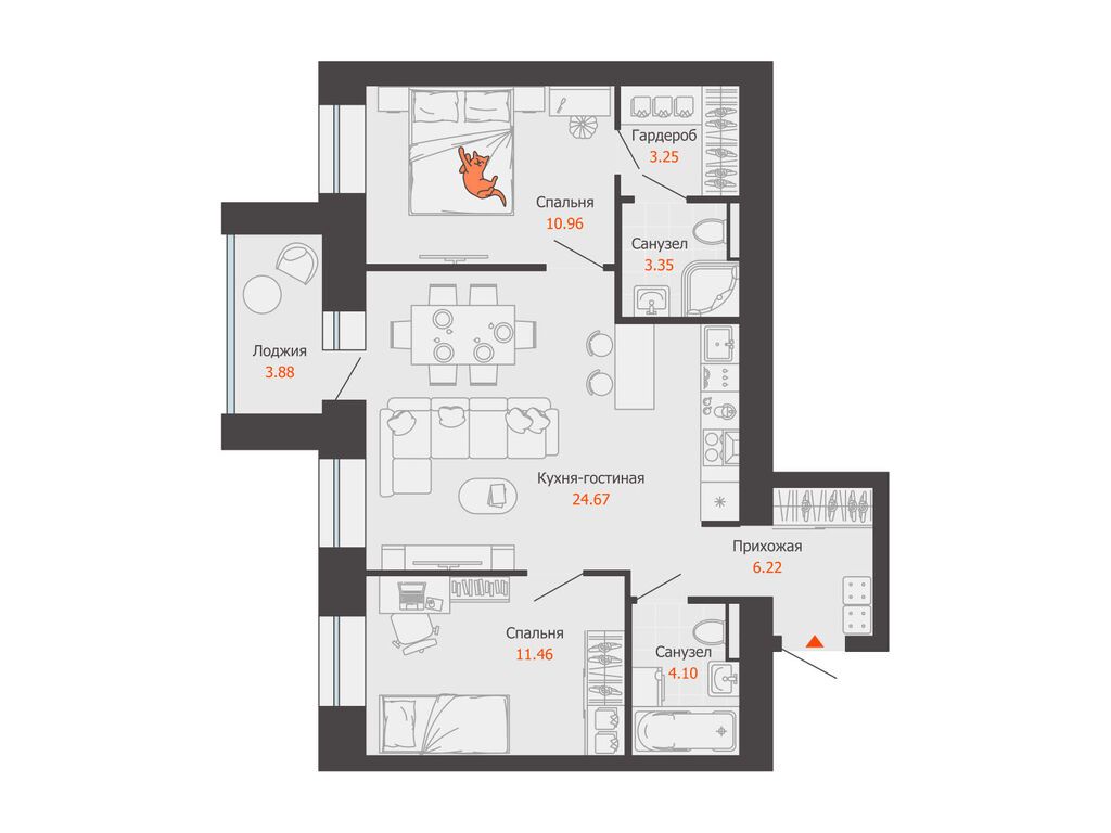 Планировка этой квартиры комфортна и приятно удивит будущих хозяев: выделены две изолированные жилые комнаты, просторный совмещенный санузел, обустроена вместительная гардеробная.