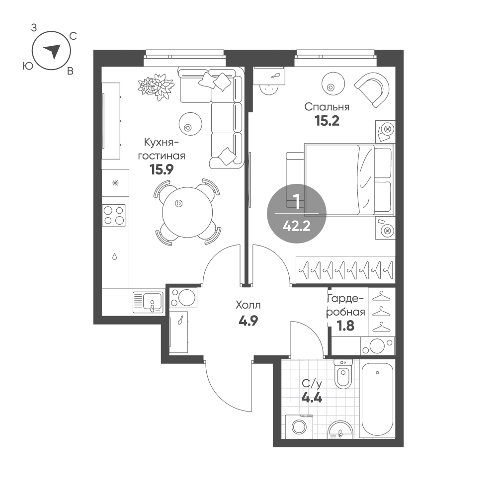 Купить 1к квартиру 42 м² в ЖК Зеленая Река