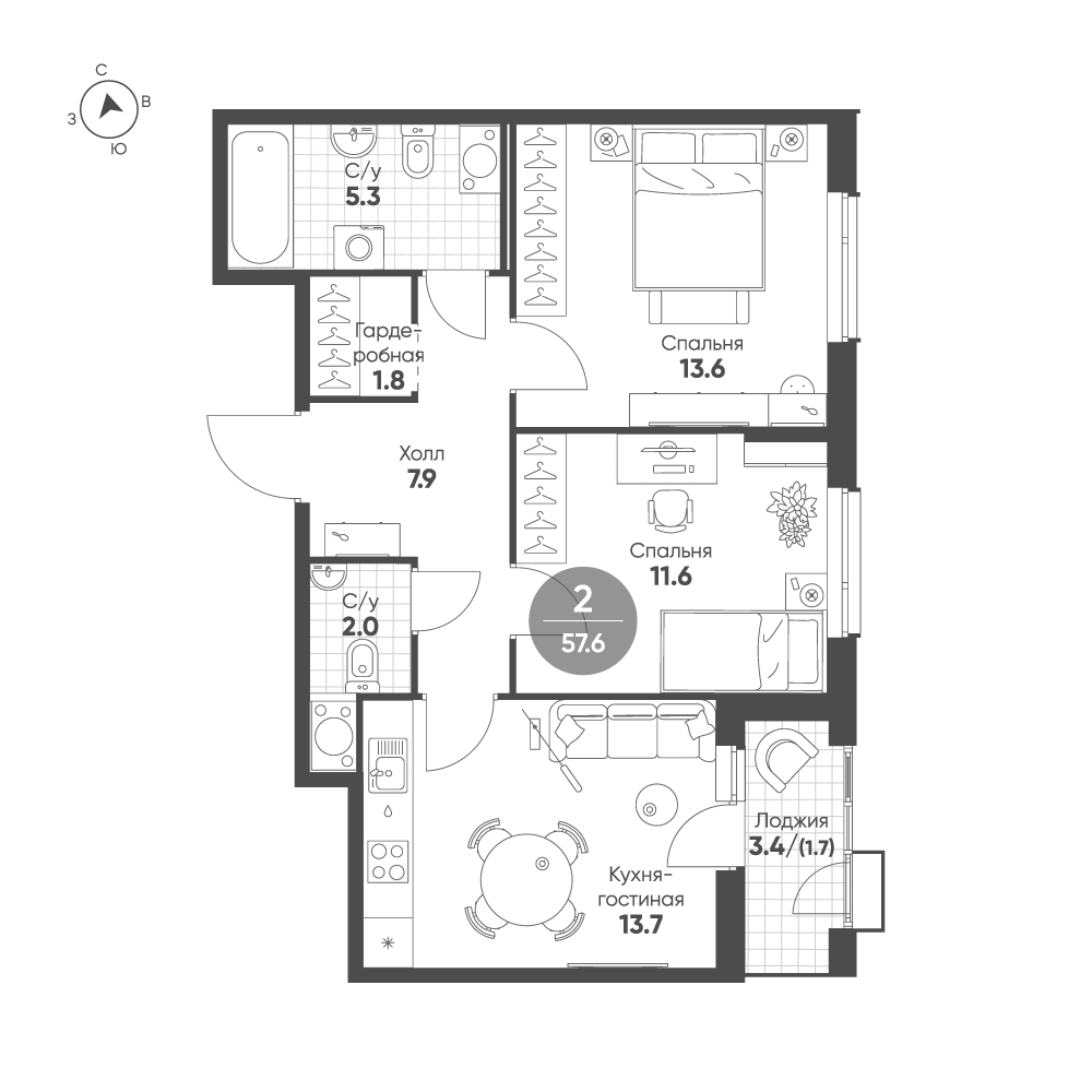 Купить 2к квартиру 57 м² в ЖК Зеленая Река