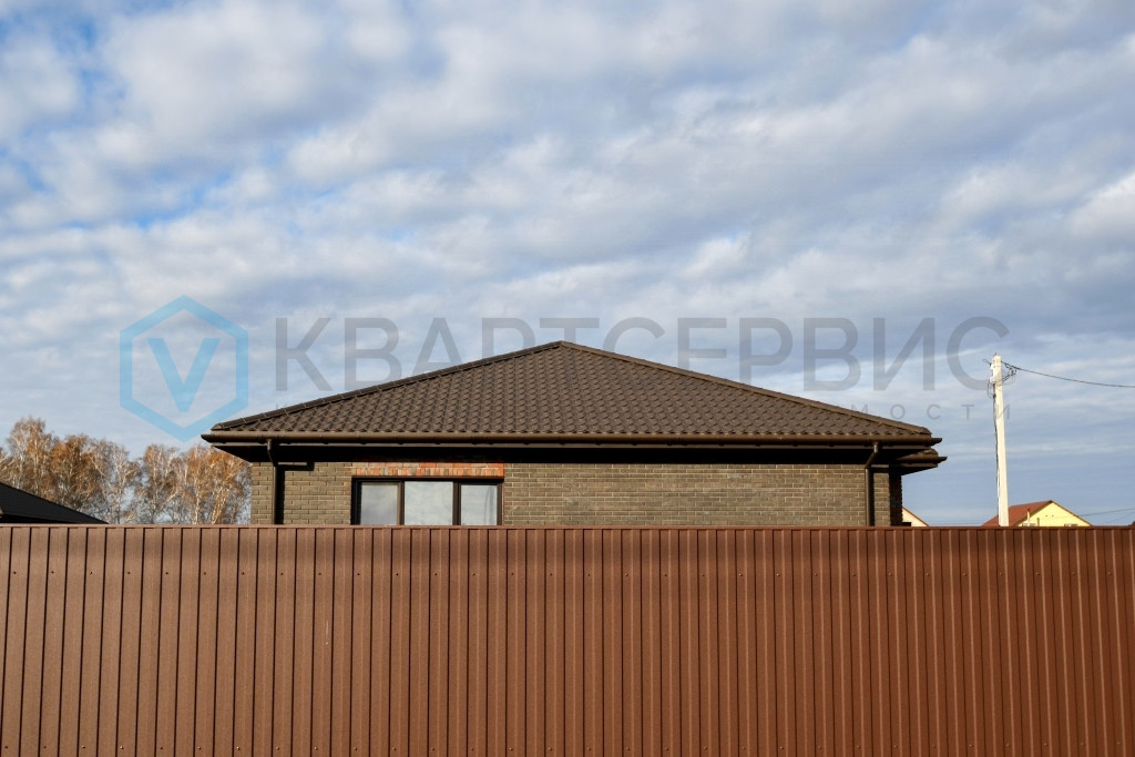 По бокам и задней части участка сделан забор из профлиста, графитового цвета.