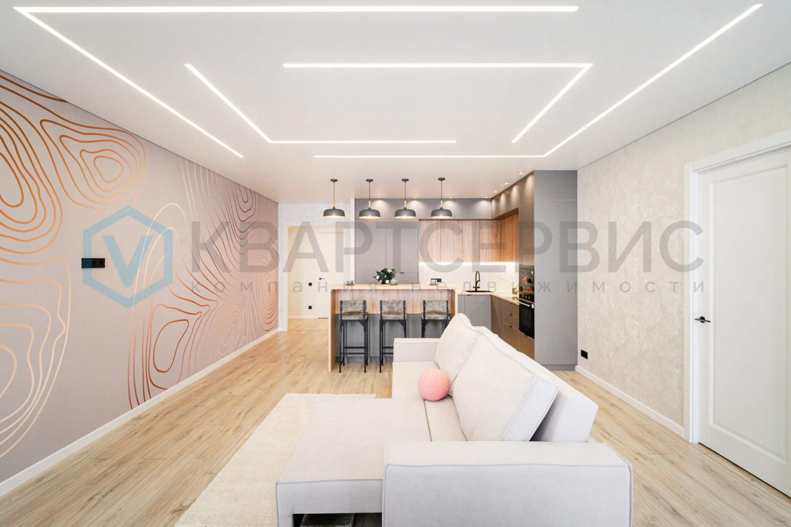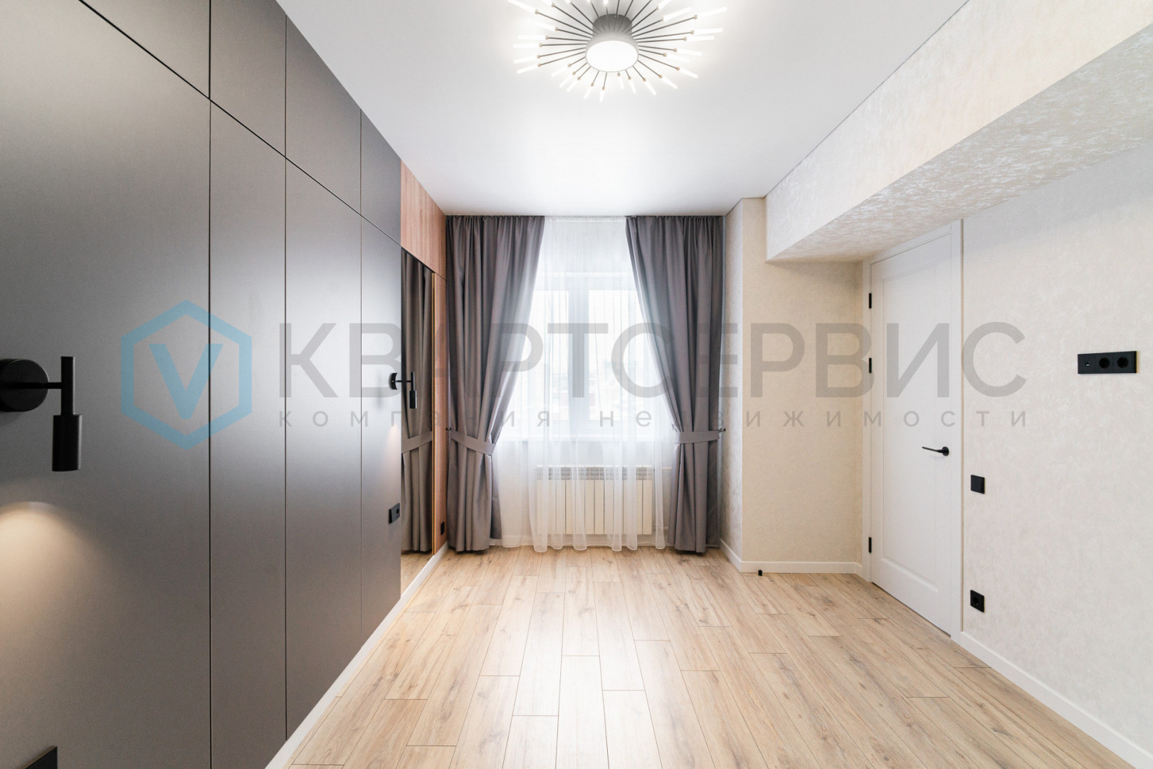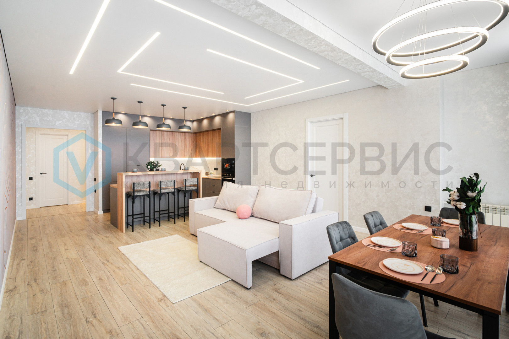 Планировка квартиры включает в себя: просторную кухню-гостиную, мастер-спальню и две детские комнаты, гардеробную, совмещенный санузел и холл.