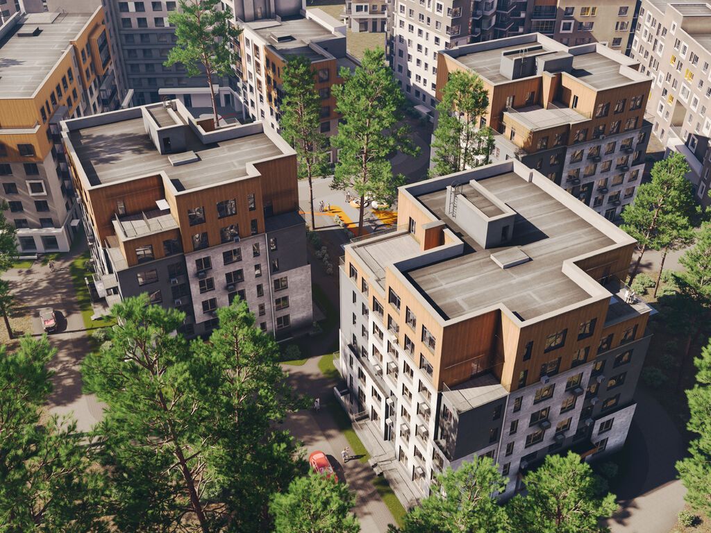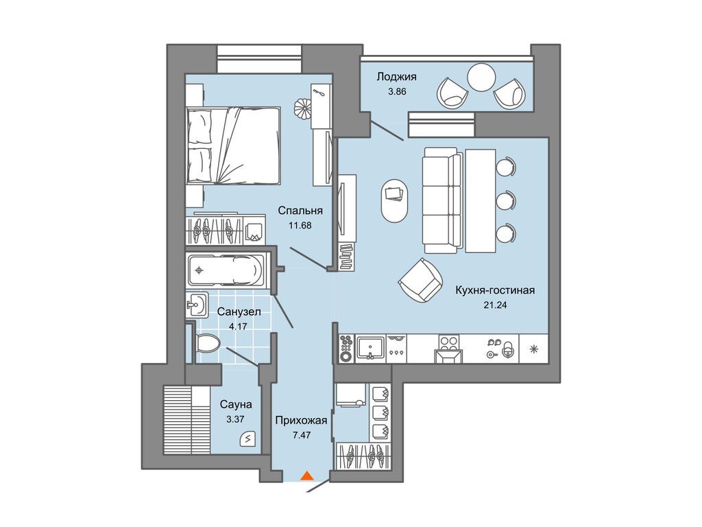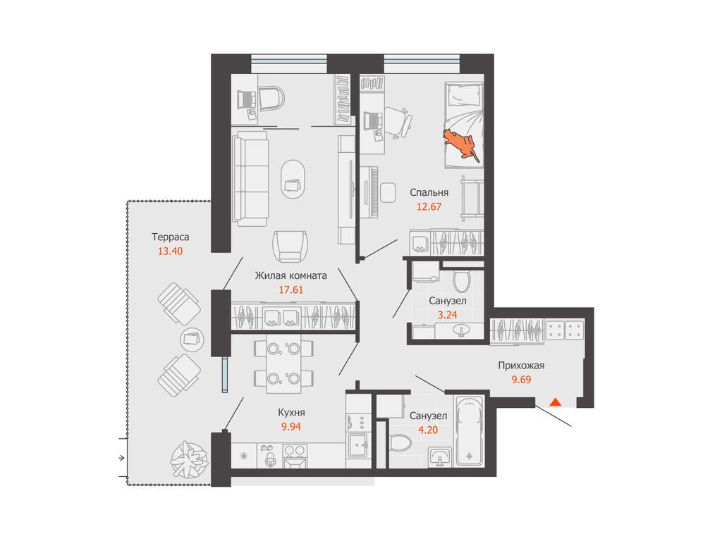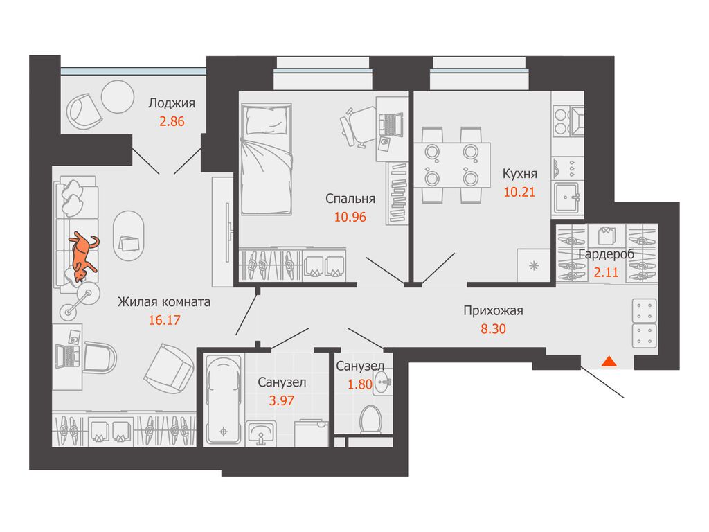 Общая площадь — 64,8 м². Просторная кухня 12 м² — место, где хочется проводить вечера. Изолированные комнаты на разные стороны (распашонка) — в квартире всегда много света и свежего воздуха.